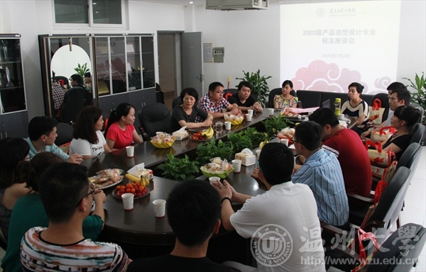 2003级产品设计班本次共有13位同学到会。他们在紧张忙碌的生活中克服重重困难从天南海北赶到温州母校重聚。座谈会上,校友们畅所欲言会场上欢声笑语不断,大家介绍了各自目前的工作、生活状态也纷纷表达了对母校的怀念之情和对老师们当年悉心教导的感激之情。