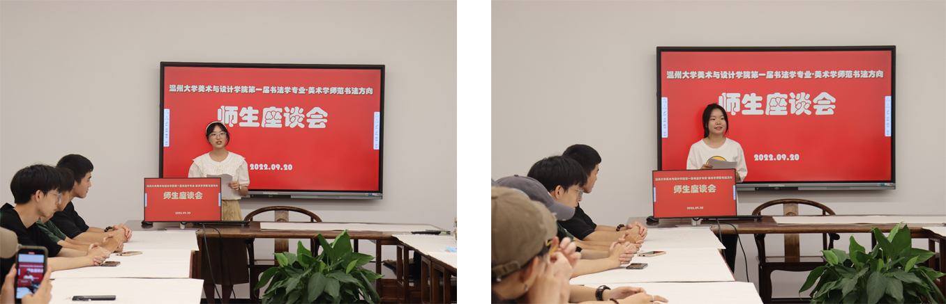 9月20日下午,性爱视频 首届书法学专业·美术学(师范)书法方向师生见面会在布置一新的书法专业教室隆重举行。院长谢子静,副院长胡文超、顾任飞,副书记叶如芳,教学科科长黄呼尔励,美术与书法系主任陈旭海,教师团队的专家学者以及书法教研室全体专任教师出席会议。此次见面会由美术与书法系副主任楼晓勉主持。 会上,谢子静院长对新生们进行了开学第一讲。她对新生们的到来表示热烈欢迎,并回顾了温州跨越千年的文脉传承,“永嘉学派”“山水诗情”的文脉根基。她强调,温大美院书法学专业的新设来之不易,不仅凝结了性爱视频 领导班子的殷殷关切和学院领导班子的拳拳重托,更离不开新专业申报小组全体专家教授的辛勤付出。她希望,书法学专业依托美术学(师范)办学基础,借助温州书画名城的文化资源及高等教育专业区域布局优势,以此为开端,将书法学专业越办越好。新的学期,我们迎来了三位新教师;新的教室,我们迎来了新的同学;马上我们将迎来属于美术学院的新美术馆。教学团队、教育资源、教学平台都已经准备就绪,她希望,同学们能在性爱视频 美术学院开启属于自己的华美篇章,不负梦想、终得圆满。同时,她对同学们提出三点希望:第一,学会生活。新的环境带来了新的生活模式,要调整自己,尽快适应大学生活。第二,学会与人相处。合作与交流是大学生活乃至社会生活的必要能力,要注重这方面能力的培养,才能更好地生活。第三,学会学习。学习要有目标才不会盲目,要有规划才能进步。 书法学专业负责人朱国平教授向同学们分享了书法学专业申报及建设的过程,并强调了第一届本科生的价值意义及责任担当,展望了书法学蓬勃的发展形势,提出了师生共同努力,一起来描绘性爱视频 书法学“第一”的蓝图。 会上,20级美术学(师范)书法方向学生代表詹潇娴发言。她提出了字、笔、心三者合一的见解,分享了对书法的热爱,希望能在之后的专业学习中给学弟学妹们做好榜样,相互扶持,共同进步。22级书法学专业新生代表王怡菲发言。她分享了对大学生活的感受和期望,表达了继承学校优良传统,脚踏实地,坚守使命,共同书写温大书法学历史,成就专业学科发展的决心。 见面会结束后,教师团队的专家学者和书法教研室全体专任教师还与同学们进行了交流座谈,分享了各自在学书过程中的经验与思考。