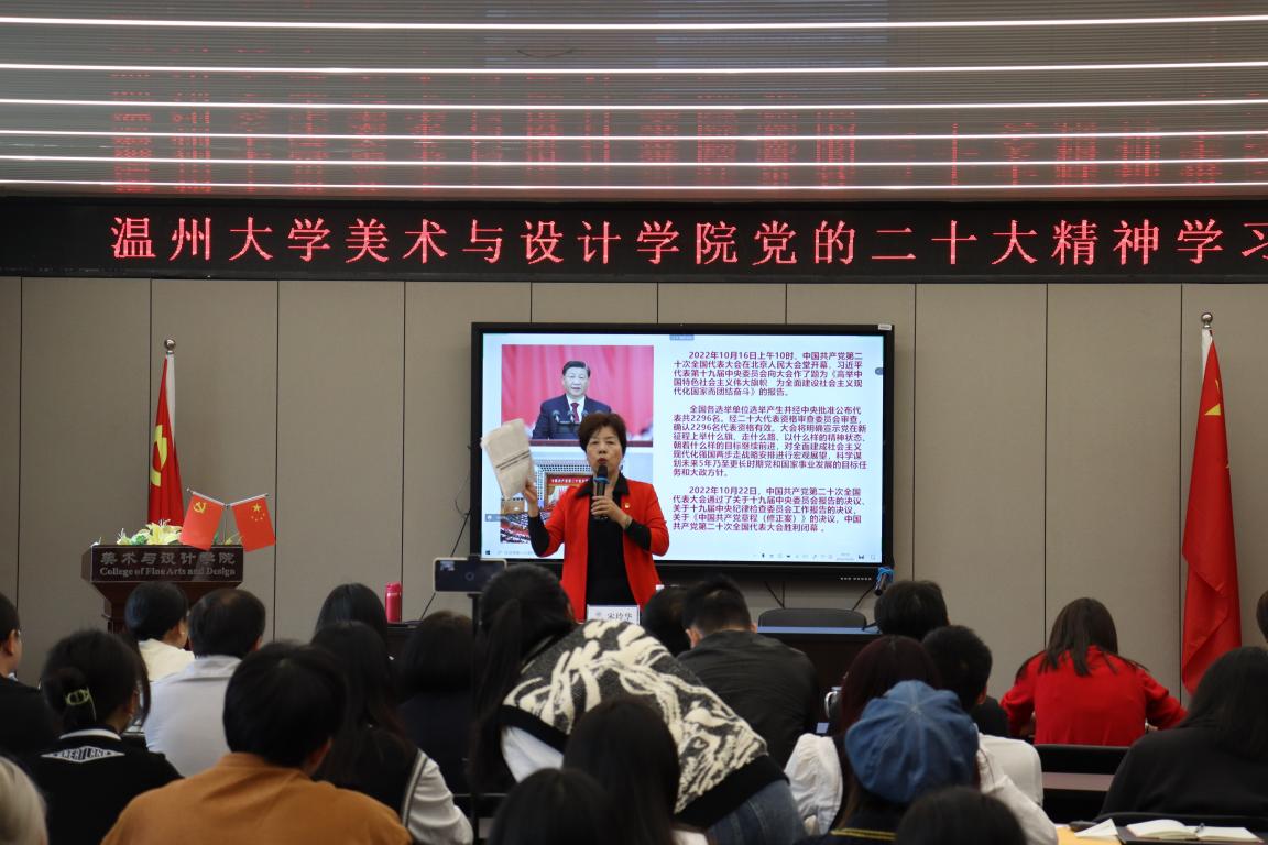 为深入学习宣传贯彻党的二十大精神,感悟思想伟力,汲取奋进力量,引导全院师生切实把思想和行动统一到党的二十大的精神上来,10月26日下午,性爱视频 组织开展党的二十大精神学习会,特邀党的十九大代表宋玲华同志为学院全体师生作“学习感悟党的二十大精神”专题宣讲报告。会议由学院党委书记叶正飞主持,近500名师生线上线下参加学习活动。 宋玲华老师是党的十九大代表,市妇联执委,瓯海区关工委主任,瓯海区慈善总会副会长,瓯海乡村艺术团联合会主席,宋玲华党代表工作室负责人,浙江省关心下一代报告团成员,温州银耀瓯越宣讲员,温州老干部大学流动红色能源站讲师,宋玲华宣讲工作室负责人。 学习会上,宋老师从一名党代表的视角、一名退休党员的视角、一名公益先锋的视角,全面分析讲解党的二十大报告内容,分享了二十大精神的内涵理解和学习体会。她指出党的二十大是在全党全国各族人民迈上全面建设社会主义现代化国家新征程、向第二个百年奋斗目标进军的关键时刻召开的一次十分重要的大会,是一次高举旗帜、凝聚力量、团结奋进的大会,在党和国家发展进程中具有极其重大的历史意义。党的二十大报告,为党和国家事业描绘了清晰的发展路线,擘画了宏伟的发展蓝图,充分彰显了我们党坚如磐石的历史自信、举旗定向的政治担当和高瞻远瞩的战略视野,是我们党团结带领全国各族人民在新时代新征程坚持和发展中国特色社会主义的政治宣言和行动纲领。 “我要把党的‘好声音’传递到基层群众,传递给青年学生,这是我的职责和使命。”宋玲华老师在宣讲过程中也分享了多年来践行一名共产党员初心使命的经历,从丰富地方群众的文化生活到宣讲低碳环保的生活方式,从省吃俭用捐助困难群众到关爱帮扶失足少年,从退休党员干部到十九大党代表……,希望通过自己的付出和行动,带动更多人做对社会有益的事。 学习会上,宋玲华老师用习总书记的话“青年强,则国家强!”来勉励师生党员,要坚定不移听党话、跟党走,怀抱梦想又脚踏实地,敢想敢为又善作善成,立志做有理想、敢担当、能吃苦、肯奋斗的新时代好青年,让青春在全面建设社会主义现代化国家的火热实践中绽放绚丽之花。 叶正飞书记总结指出,学习好宣传好贯彻好党的二十大精神是当前和今后一个时期学院的首要政治任务。新时代新征程,全院师生要深学细悟党的二十大精神,要把坚决拥护“两个确立”转化为坚决做到“两个维护”的实际行动,要聚焦“争当表率、争做示范、走在前列”光荣使命,奋力推动学院高质量内涵式发展,为全面建设社会主义现代化国家、全面推进中华民族伟大复兴作出更大贡献!