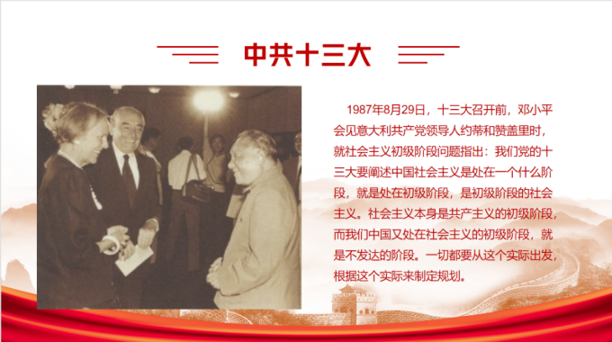 通过此次微讲堂,我们走进了中共十二大、十三大。十二大提出建设有中国特色社会主义的思想为整个改革开放和现代化建设的指导思想。十三大阐明了党在社会主义初级阶段的基本路线:一个中心,两个基本点,并提出社会主义现代化建设分三步走的战略部署。