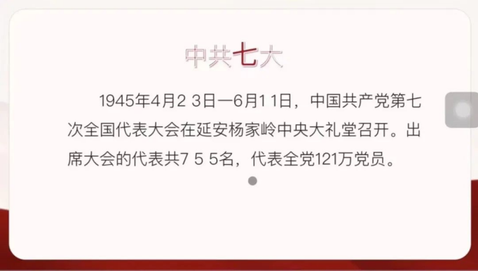 中共七大:1945年4月23日-6月11日,中国共产党第七次全国代表大会在延安杨家岭中央大礼堂召开。出席大会的代表共755名,代表全党121万党员。