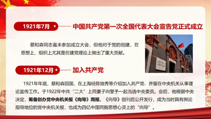为了探寻中国革命道路,1919年12月,蔡和森赴法国勤工俭学,学习并翻译了上百种介绍马克思列宁主义和俄国革命的书籍。期间蔡和森同国内的毛泽东等人通信,第一次提出要“正式成立一个中国共产党”。1921年12月,回国不久的蔡和森加入中国共产党。