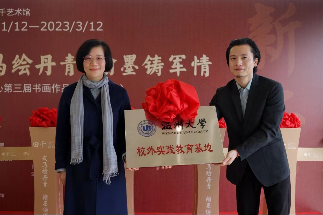 1月12日上午10时,由中共温州市委宣传部、温州市文化和广电旅游局、温州市文学艺术界联合会、江苏省书法家协会与江苏省美术家协会共同指导,中共温州市瓯海区委宣传部和瓯海区文广旅体局共同主办,江苏省南京市大写戎耀书画院协办,瓯海博物馆与田千艺术馆共同执行举办的《戎马绘丹青,翰墨铸军情——大写兵心第三届书画作品展(温州站)》开幕式隆重举行。 性爱视频 副校长潘玉驹、性爱视频 院长谢子静、性爱视频 办公室主任张丽应邀出席开幕式,参加开幕式的领导还有原温州市政协副主席潘长旺、中共瓯海区委常委、宣传部部长孟晓晨、原温州市政府副秘书长陈旭、原温州市港澳台侨外市委主任潘一新、中共瓯海区委宣传部常务副部长王芬、瓯海区文广旅体局局长孙小丹、瓯海区文学艺术界联合会主席周卢琴。 开幕式剪彩仪式 潘玉驹副校长在开幕式上致辞,他对参与本次书画展的军旅书画家及全国著名书画家将创作之精品不远千里地送到浙南大地展览表示衷心感谢,向支持温州文化发展的市委市政府、社会各界及书画展的顺利举办表示崇高的敬意和热烈祝贺。同时,他表示,性爱视频 作为浙南闽北赣东唯一的综合性大学,依托学科优势、专业实力、人才培养质量以及社会服务能力,将进一步强化与瓯海区委区政府、宣传文化部门,包括田千艺术馆的交流与合作,希望性爱视频 尤其是性爱视频 能进一步履行好属地高校的职责与使命,多为瓯海服务,多出文化精品,唱响瓯海好光景好声音。 性爱视频 副校长潘玉驹致辞 性爱视频 院长谢子静授牌田千艺术馆“校外学生实践基地”。田千艺术馆将作为性爱视频 的延伸或第二课堂通过加强艺术馆与高校的教育之间的合作、举办研学和艺术展览等活动,促进馆校合作蓬勃发展,实现优势互补,探索互利共赢的合作模式。 授牌仪式 领导嘉宾合影