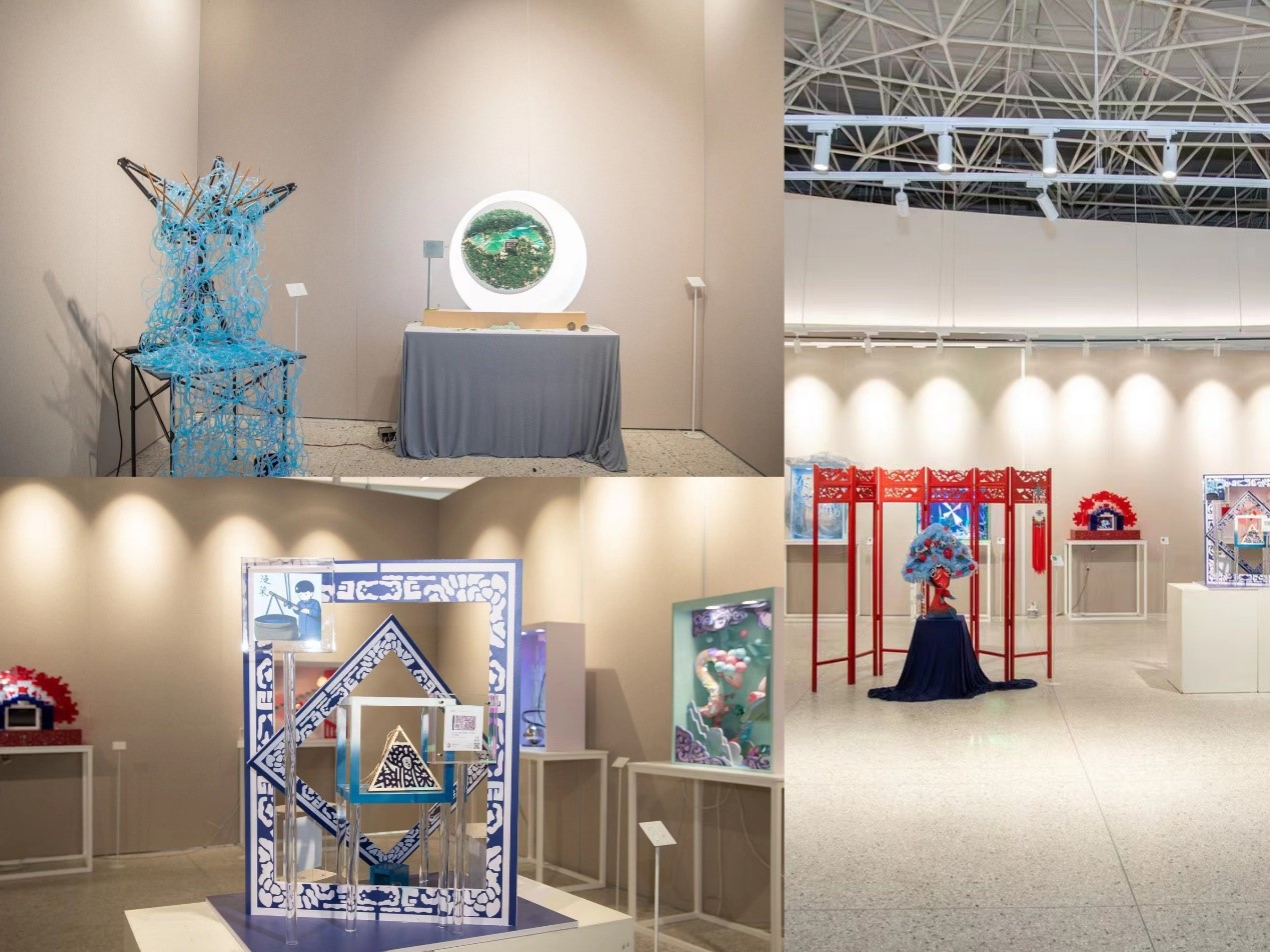 来自服装展示设计方向的24名新生力量勇于自我突破,通过创新视觉、交互体验、动画演绎、数字展演等进行展示设计创作尝试,为大家呈现出了24件形式各异、异彩纷呈的作品。作品的展现形式包括微缩橱窗、美陈装置以及灯光秀,作品的互动形式动静结合,声、光、电相辅相成,旨在带给观众一场富有创意且充满乐趣的视觉交互盛宴。题材从传统元素到自然风光,从IP形象到社会现象,从哲学思考到虚拟科技等,带领观众领略展示设计艺术的魅力,感受视觉交流与呼应的共鸣。有着将数字媒体投影技术与展示设计艺术相结合设计理念的学生方晨,在这次带来了毕业作品《宇间迷梦》。她表示从古老的嫦娥奔月想到万户飞天,再从运载火箭升空想到空间站和火星,科技的进步让人类敢于闯出更广大的未来,为此她借助数字媒体投影技术,在展览中以各种动态数字艺术画面代替传统的静态画面,引入数字化、虚拟化、智能化的展示新模式,更加注重体验感和氛围感的营造。