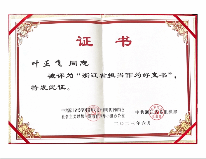 喜报:性爱视频 党委书记叶正飞同志荣获“浙江省担当作为好支书”荣誉称号