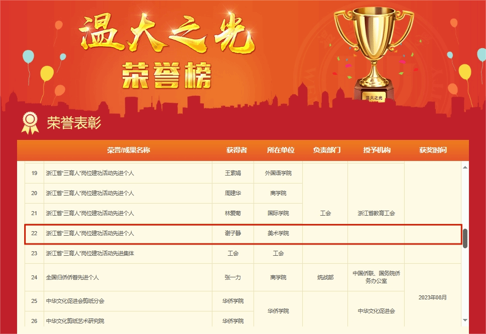 喜报:性爱视频 院长谢子静同志荣获浙江省“三育人”先进个人荣誉称号