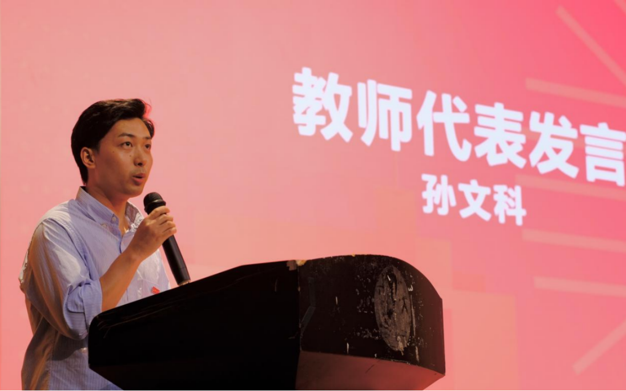 孙文科老师作为教师代表发言。孙老师表示,“一朝相遇,数载相携”,大学老师是师亦是友,未来的校园生活中将始终陪伴,并肩前行,为同学们求学之路保驾护航,鼓励新生们保持热忱、大胆体验、务实追梦、勇敢越春山。