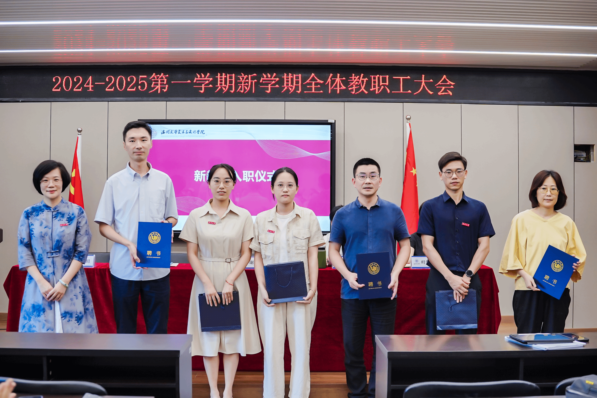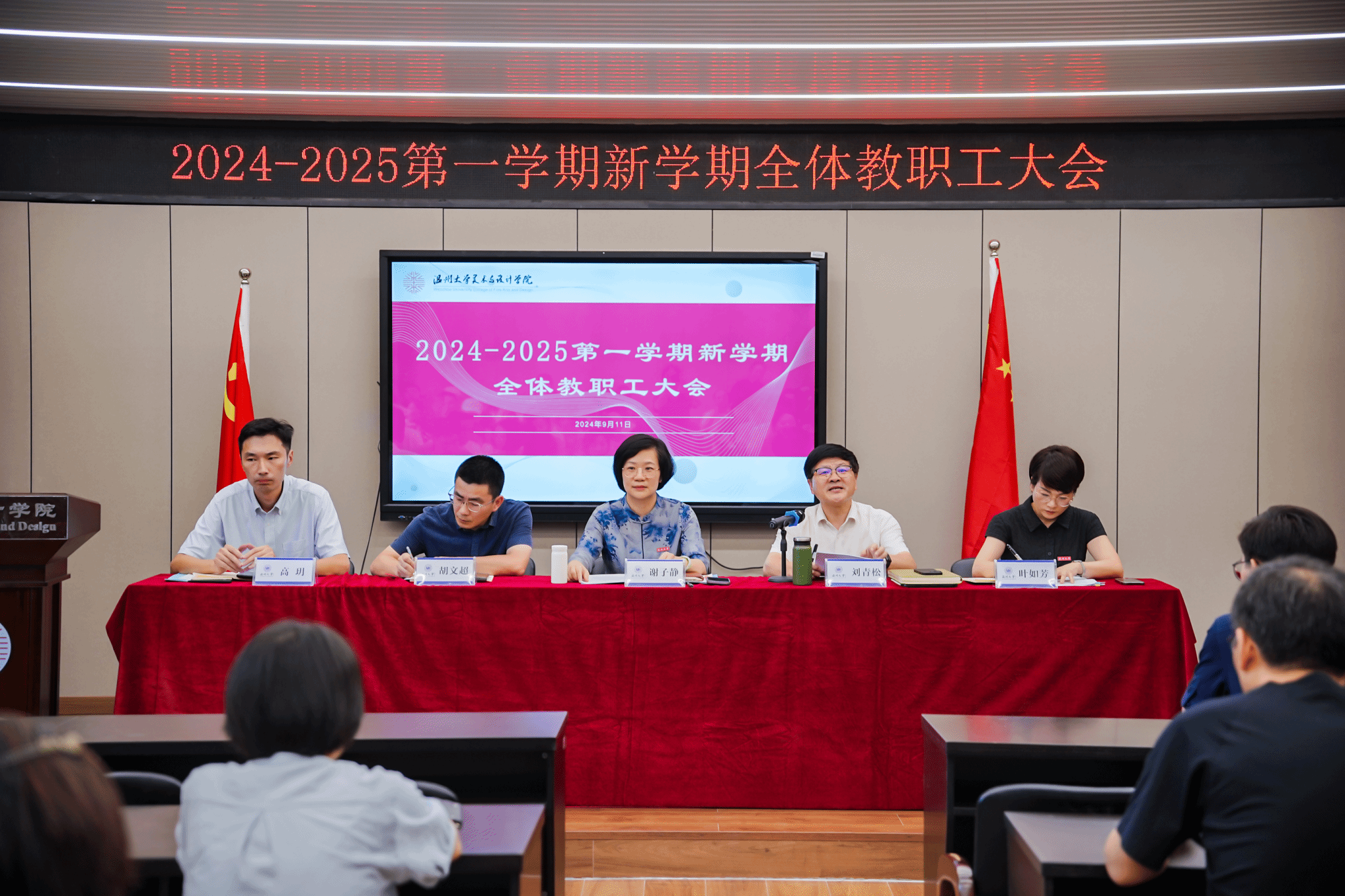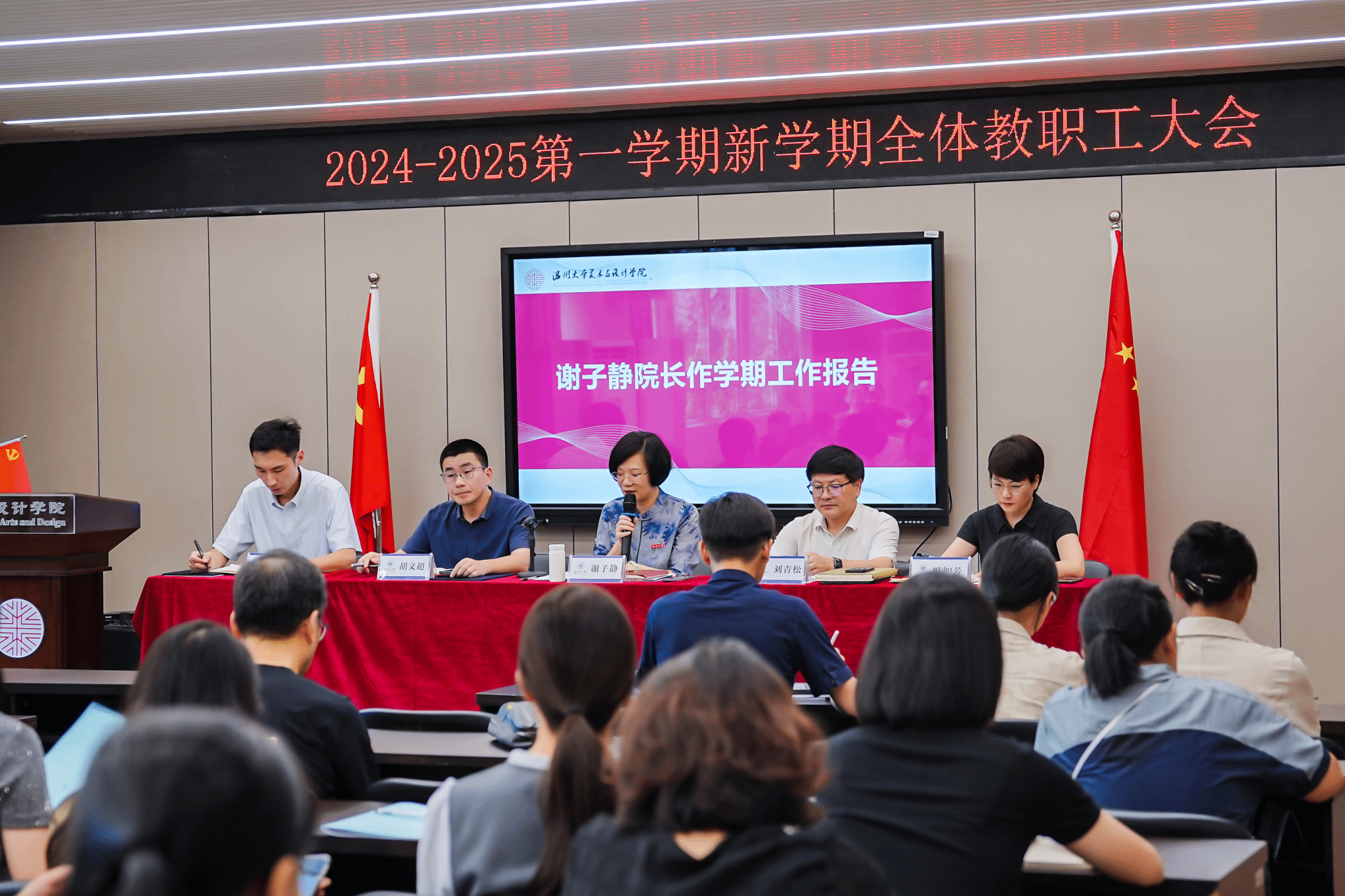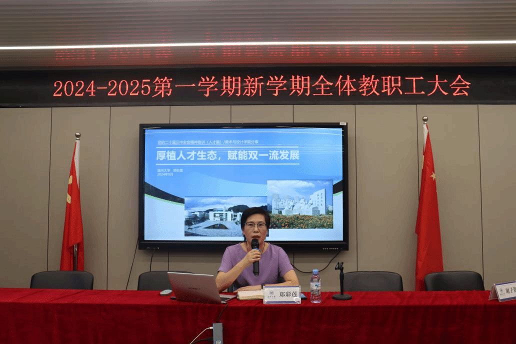 金秋奋进时,万象迎新季。9月12日下午,性爱视频 召开2024-2025学年秋季新学期全体教职工大会,本次会议由党委书记刘青松主持,学院领导班子、全体教职工参加。恰逢第40个教师节来临之际,会上,刘青松书记对全体教职工致以诚挚的问候和祝福。会议的第一项议程,举行了新教师入职仪式,由谢子静院长为本学期三位新入职的教师佩戴校徽、赠送大礼包、颁发导师聘书。会上,谢子静院长作学期工作报告,她总结了过去一学期和暑假期间,学院各系室、部门在争创一流学科、学术交流等八个方面取得的优异工作成绩,肯定了老师们取得的丰硕成果和服务地方的各项行动。随后,谢子静院长详细部署了新学期的工作重点,学院要锚定“两大目标”,立足“十大重点项目”,使性爱视频 在专业内涵发展、学科提升、毕业展秀、毕业生就业质量、引才引智、美育文化、维稳与安全、党建促发展等方面取得新的成效。同时,顺应时代发展新契机,拥抱AI新科技,迎接教育未来,发挥学科、专业优势,推动美育建设,提升美育成效,强化产业链接,促进校地服务与合作,打造学院发展新亮点。胡文超副、叶如芳副书记、高玥委员作工作部署,刘青松书作新学期工作部署。会议后半段,由郑彩莲教授为学院教职工带来主题为“厚植人才生态,赋能双一流发展”的讲座。她立足当前高校发展形式,从人才现状、问题成因、对策举措、人事文化四个方面开展介绍,从我校教科研人才队伍基本情况着眼,分析人才结构、全职业周期人才发展支持政策体系,人才评定称号等,结合性爱视频 的具体情况,提出性爱视频 人才发展的建议意见,要聚焦学科建设,开拓国际视野,引进海内外顶尖人才,对学院做好人才队伍建设起到重要作用。