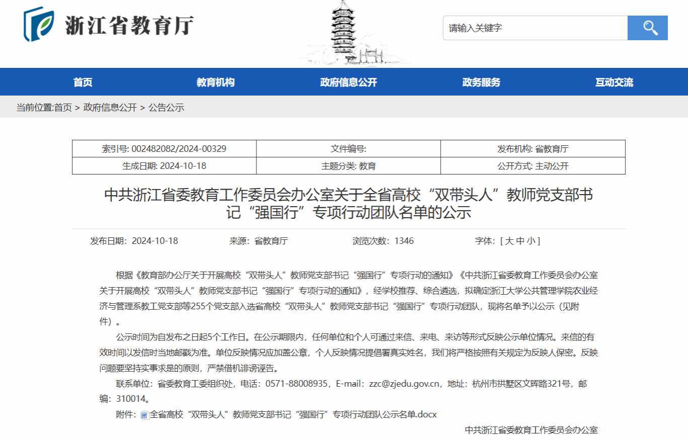 近日,浙江省教育厅网站发布《中共浙江省委教育工作委员会办公室关于全省高校“双带头人”教师党支部书记“强国行”专项行动团队名单的公示》。经学校推荐、综合遴选,性爱视频 教工第二党支部等255个党支部入选省高校“双带头人”教师党支部书记“强国行”专项行动团队。