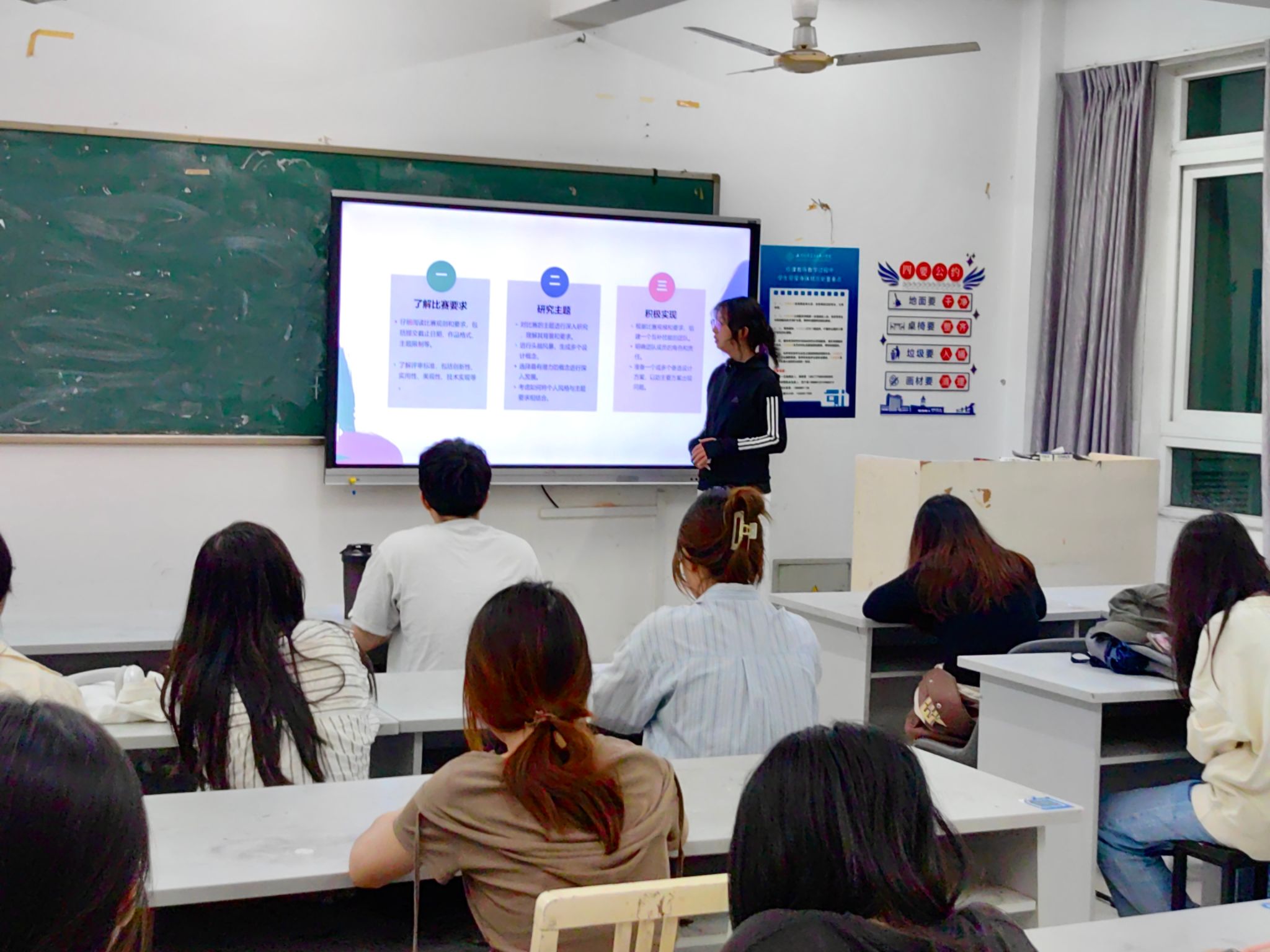 2024年9月28日,22视传1班的张智丽同学进行了竞赛经验分享。围绕竞赛相关事宜,张智丽同学就赛前准备与作品准备两个阶段提出几点注意事项,并着重于团队协作方面分享了自己的经验和建议。通过本次活动,同学们对竞赛流程和规则有了更深入地了解,为参与竞赛补充了理论知识,也为后续创作出更多优秀作品提供了经验支撑。