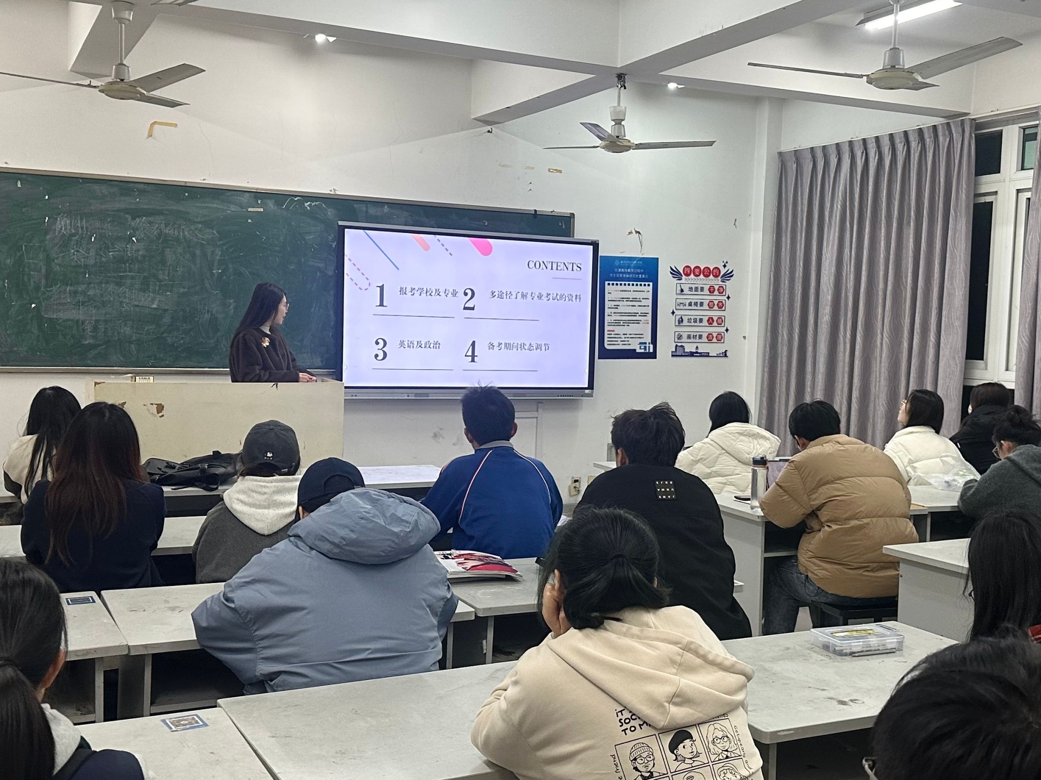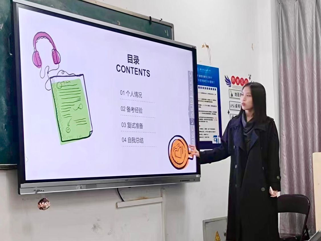2024年12月1日,23研究生2班的蒋佳慧同学进行了考研经验分享。蒋佳慧同学将公共课与专业课的学习策略逐一剖析,点明公选课要重视日常积累,专业课则需要兼顾基础与创新。这些学习策略的分享,指导着同学们不仅要在日常学习中夯实根基,更要以创新思维突破专业瓶颈。蒋佳慧同学的经验分享为同学们提供了更为明确的备考方向,也帮助大家在考研中有了更加清晰的学习规划。