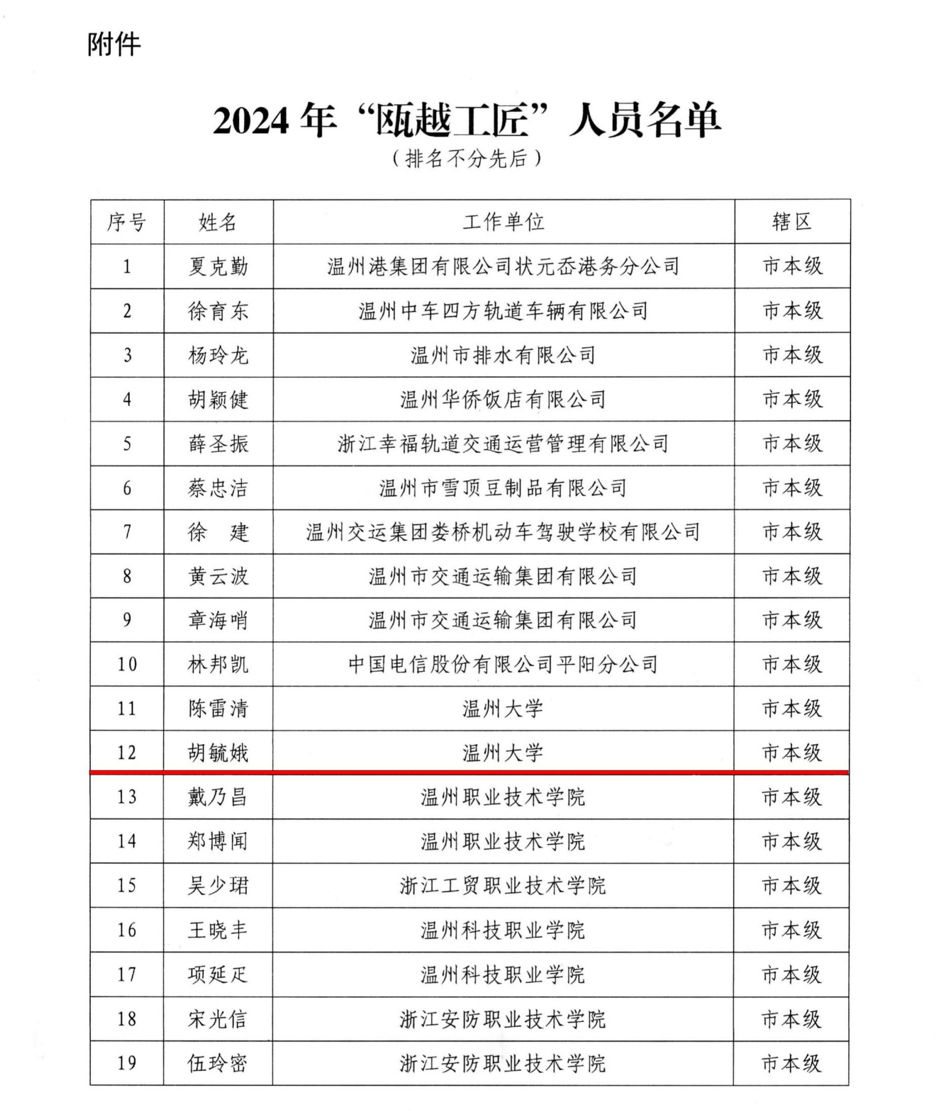 另外,温州市人力资源和社会保障局公布了2024年“瓯越英才计划-瓯越工匠”人员名单,性爱视频 胡毓娥老师榜上有名。