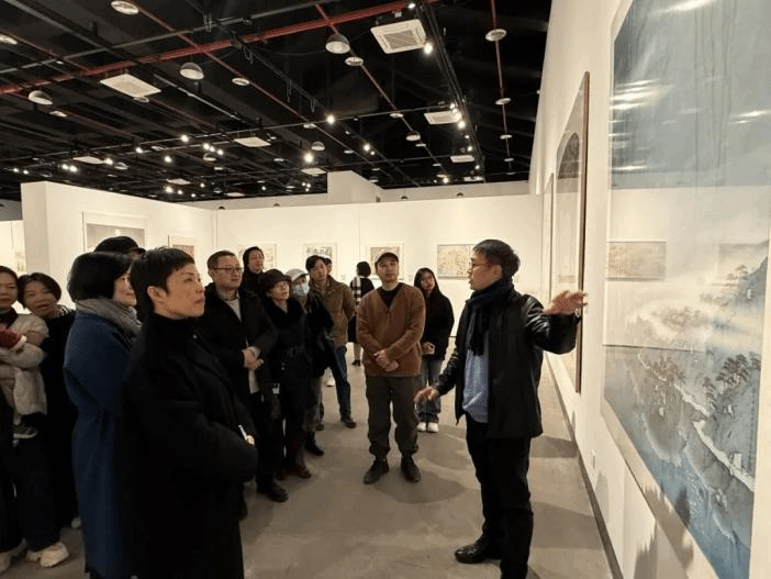 开幕式结束后,本次展览策展人梁腾为各位领导嘉宾做现场导览。