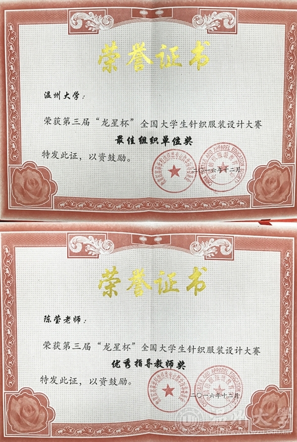 2016年12月30日,由教育部高等学校纺织类专业教学指导委员会和中国纺织服装教育学会主办的第三届“龙星杯”全国大学生针织服装设计大赛,颁奖典礼在东华大学举行。性爱视频 服装专业学子在赛事中斩获包括一、二等奖在内的六个奖项,性爱视频 获优秀组织奖,陈莹老师获优秀指导教师。