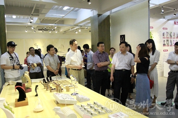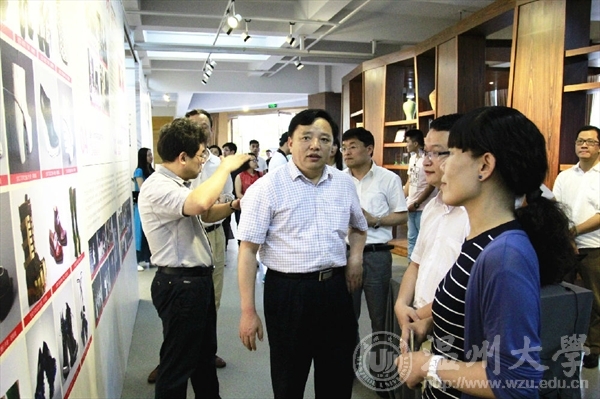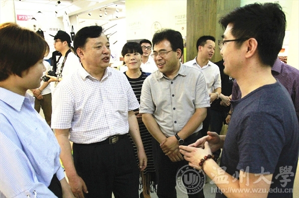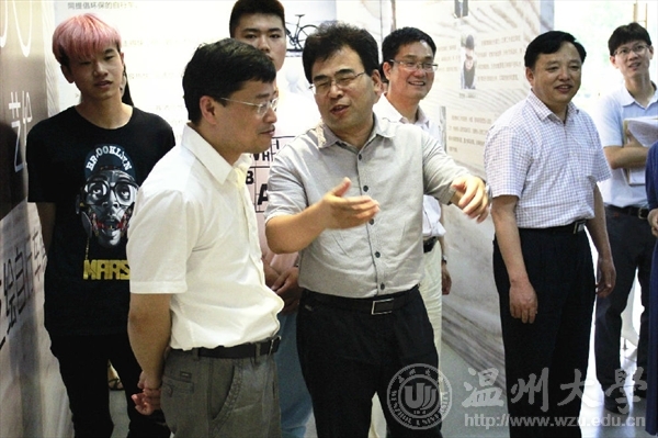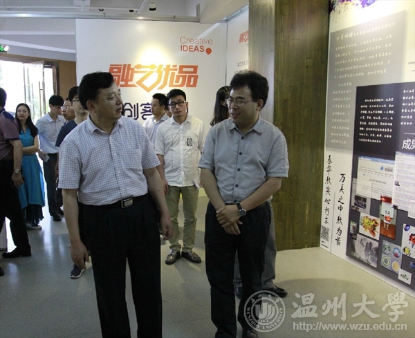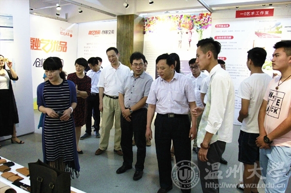 6月15日上午,全国创新创业50强评审专家陈年友、李斌、陈学军、陈森一行来性爱视频 学生创新创业实践场地参观和实地考察,校党委副书记牟德刚、副校长薛伟及相关部门负责人等一行领导陪同参观调研了温州时尚学院和“融艺优品”创客空间的创新创业项目。