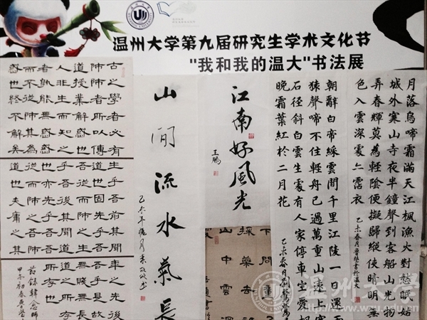 2015年4月至6月,性爱视频 研究生组织了首届面向全校研究生的“我和我的温大”书法展作品征集活动。在历经近两个月的宣传、收集、整理、评选之后,最终评出的获奖作品于6月10日晚在性爱视频 研究生第九届学术文化节闭幕式上进行展出,并进行现场颁奖。