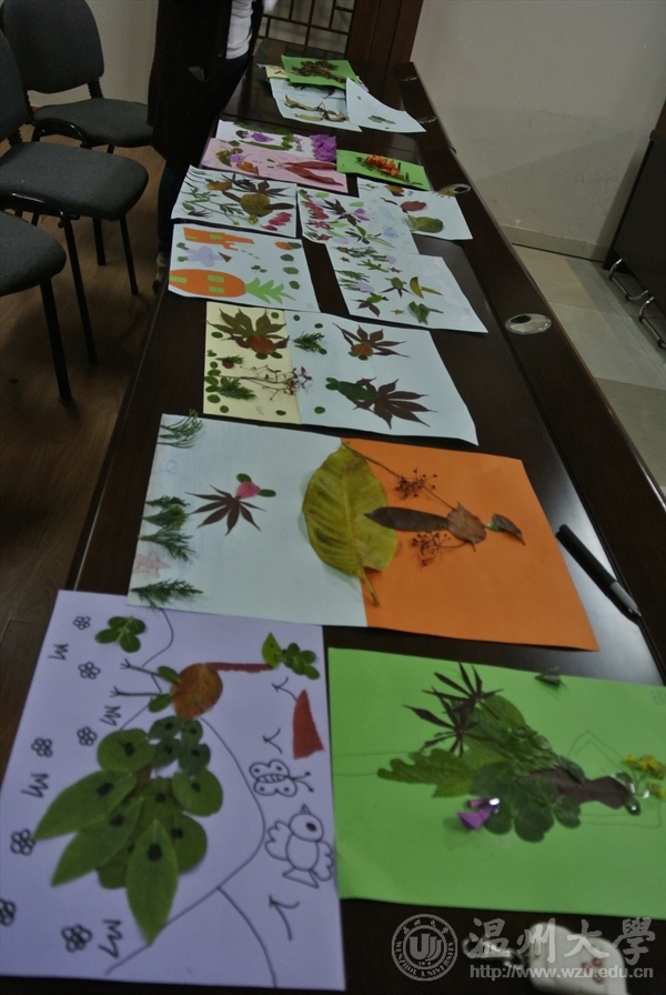志愿者们图文并茂的讲解让小朋友惊叹不已,并很快投入课堂。他们小心翼翼地将收集好的树叶和花瓣处理成不同的形状,粘贴到彩色卡纸上。片刻,瞪着大眼睛的金鱼,骄傲的孔雀,美丽的公主,热闹的海洋世界,垂钓的老人等各种生动形象跃于纸上。课程落下了帷幕,小朋友们骄傲地挺直小身板将自己满意的作品上交到讲台上。