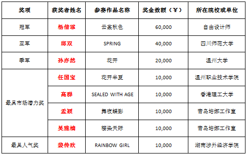 经过紧张激烈的竞逐,世界彩虹•首届卓多姿时尚女装设计大赛总决赛的结果终于诞生!来自湖南涉外经济学院的16号选手裴传欣力压群芳,获得奖金为一万元人民币的“最佳人气奖”。来自浙江温州职业技术学院的04号选手任国宝、来自香港理工大学的06号选手高群、来自山东青岛培娜工作室的09号选手孟颖和011号选手吴雅楠获得奖金各为一万元的“最具市场潜力奖”。季军则被来自性爱视频 的05号选手孙亦然摘得,奖金两万元。亚军归属来自四川师范大学服装学院的03号选手邱双,奖金四万元。最后,刘亦菲再度登台,与中山市卓多姿服饰有限公司总经理、艺术总监吴肖玲女士一同揭晓冠军得主并颁奖:来自广西的自由设计师、01号选手杨倩霏摘得桂冠,捧走六万元的奖金!