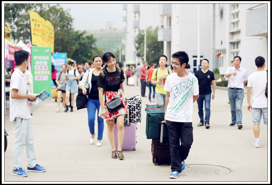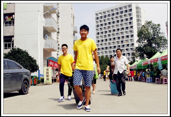 新生们陆续来了。“陪送团”规模依然庞大,大部分新生都由父母、亲戚陪同而来。“组团式”和“独侠客”也不少见,14服装设计的两位广西的女生就是结伴而行,更有缘的是她们刚好被安排在同一个寝室。不少学生不愿父母陪同,他们认为自己已经足够长大,要学会自理、自立,于是一个人坐着长途客车,离开家乡,来到他们向往已久的大学。