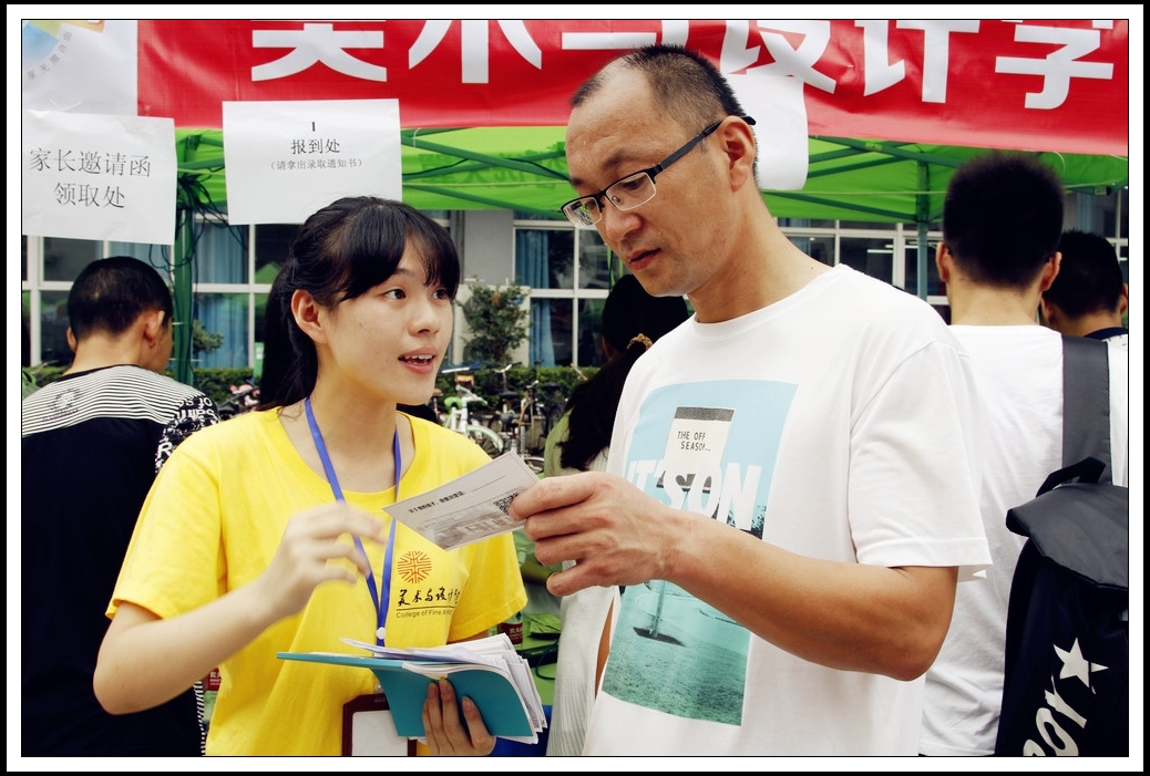 陪同来报到的家长都会收到一份“新生家长见面会”邀请函,这是一次让家长了解学院,让学院了解新生的邀请。一位大二的学生正为学生家长耐心说明家长会的时间、地点和重要意义。在迎新大本营里,他们诚恳地邀请每一名家长。
