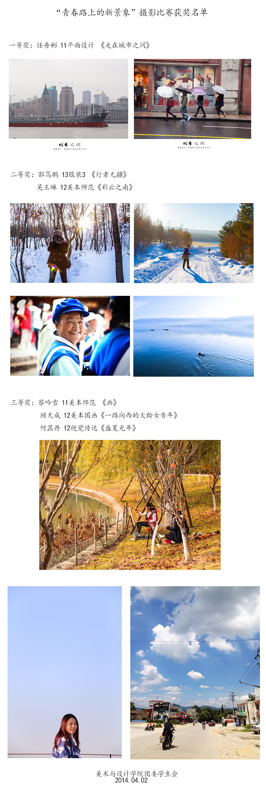 3月 3日—3月18 日,性爱视频 团委学生会素质拓展部开展了主题为“青春路上的新景象”的摄影比赛,本次活动特邀了性爱视频 学生科辅导员陈赛慧老师担任评委。 活动得到了许多同学的积极参与,同时也征集到了很多优秀作品。拍摄的画面有穿梭于城市街角的忙碌身影;有大东北冬日的雪地风光;有用画笔描绘温大的美丽校园;更有一路向西的大龄女青......同学们用镜头捕捉下了生活中的美好瞬间,留住了点滴的温暖和幸福,让稍纵即逝的感动成为永恒! 摄影,是记录,也是创造。透过镜头,瞬间的精彩被永远封存,它是一门让广大学生既陌生又好奇的艺术,它能形象地记录发生在我们身边的点点滴滴。此次活动为在校大学生提供了一个展示自我摄影技能的平台,丰富了同学们的课余生活。青春路上并不缺少美,只等你去发现! 附:“青春路上的新景象”摄影比赛评选结果: 一等奖:11平面设计 任舟彬《走在城市之间》 二等奖:13服设4班 郭笃鹏《行者无疆》 12美本师范 吴王琳《彩云之南》 三等奖:11美本师范 蔡吟雪《画》 12美本国画 顾天成《一路向西的大龄女青年》 12视觉传达 何菡丹《盛夏光年》