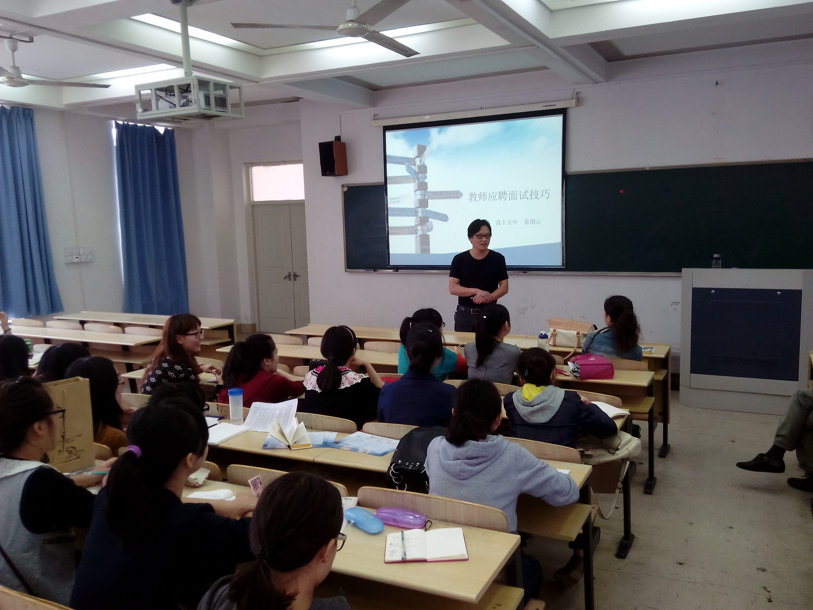 优秀的面试是成功的敲门砖,为培养在校美术师范生的应聘技巧,11月6日下午一点半,温州市十五中美术教师蓝鹏云老师和龙湾二小美术教师包新新老师在3A-201为同学们做了《美术教师应聘技巧座谈》专题讲座,主持此次讲座的是性爱视频 研究生办公室主任胡建南老师。