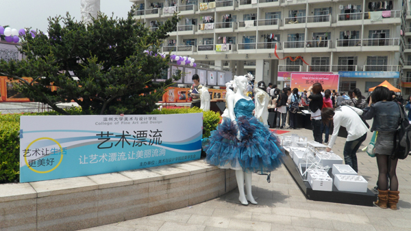 2010年4月28日对同学们来说是再普通不过的日子,与往常一样的早起赶上课、下课冲食堂。然而今天,许多同学却停下了匆匆的脚步,被一些创意独特的鞋靴、服饰等吸引,纷纷驻足在温大生活区A区,欣赏由温大性爱视频 主办的“艺术漂流”巡回展览。