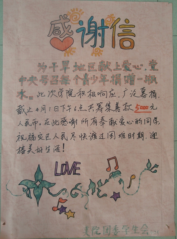 为响应共青团中央号召,弘扬“一方有难,八方支援”的中华民族传统美德,帮助西南灾区人民战胜灾害、顺利度过难关。4月1日上午,性爱视频 团委学生会发起了“抗击干旱,你我同在——为西南灾区献爱心”活动,倡议全院同学为灾区献爱心。