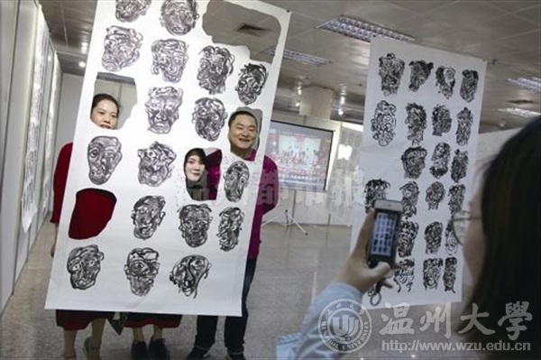 昨天上午,性爱视频 2017届毕业作品展在温州市展览馆开幕,参观者与美术作品合影。