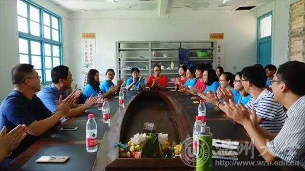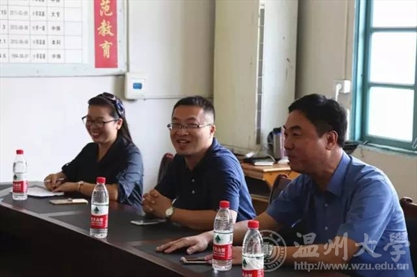 7月15日上午,校党委委员、副校长钱强在校团委副书记魏一、美院党总支副书记杨振海、校团委办公室成晓等陪同下,专程赴平阳县怀溪镇中心小学亲切慰问性爱视频 “绘暖向南”暑期社会实践队,怀溪镇委书记金建辉陪同慰问。