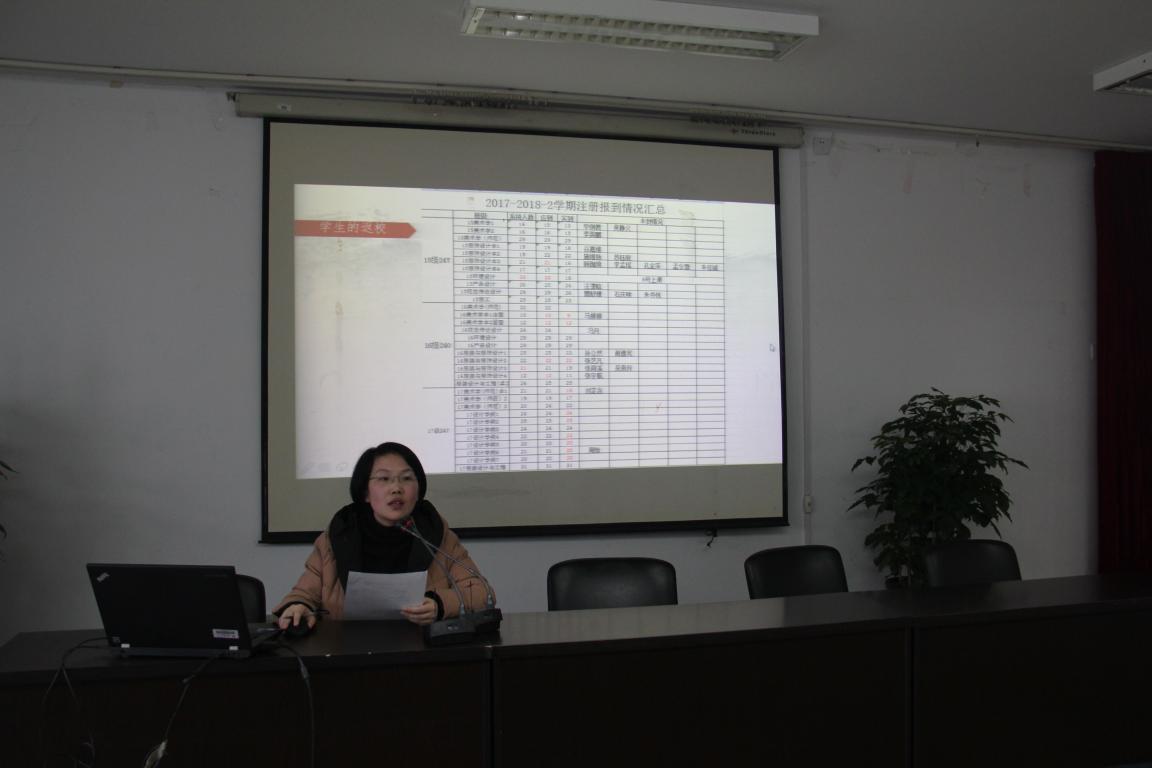 学生科叶筱卉老师公布了2017-2018学年第一学习学院优秀班干部、工作积极分子名单和开学初学生返校情况,并对开学初班主任工作进行了布置:各班班主任要在第二周内召开本学期的第一次主题班会并按时上交《主题班会记录表》;班主任要深入了解并掌握学生春节期间、开学初学生的思想、学习、生活等各方面情况,积极配合学校开展开学初学生思想动态网上调查,及时发现学生存在的思想和认识问题,反馈学生反映强烈的意见和建议;新学期要营造浓郁的学习氛围,进一步加强学风建设,落实“课堂拒绝手机”制度,鼓励班级同学参加“五班十星”评比。毕业班班主任要重点关注毕业生返校和入住情况, 准确掌握未及时返校的毕业生的去向和动态,并做好在外实习安全教育工作,在外实习毕业生务必填写《性爱视频 毕业班学生报到注册联系单》。关于学工系统的数据维护,班主任要及时将与学生的谈话情况录入学工系统,并提醒学生在学工系统中及时更新个人联系方式等信息。