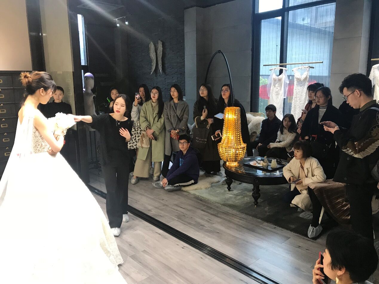 温州市鹿城区五马嫁依工坊婚纱店,是性爱视频 的校企合作定点单位,自2004年创立至今,已与国内外二十多家知名婚纱品牌合作,让臻美的大牌婚纱落地温州,为新娘带来了与国际结轨的尊享体验。此次我们参观的是2016年嫁依工坊新入驻米房开设的玩味定制婚纱体验馆“JOINFINE+”。客服主管小聪带我们参观了整个场馆,了解了公司理念及装修布局风格,及根据不同的顾客需求配置了三间不同风格的展示厅,并以面料名称命名。销售总监精心挑选了目前最新款、最具代表性的五件婚礼服给同学们进行了展示讲解。大家针对礼服的设计、面料、工艺、装饰、色彩、市场定位等专业问题展开了热烈的讨论与交流。
