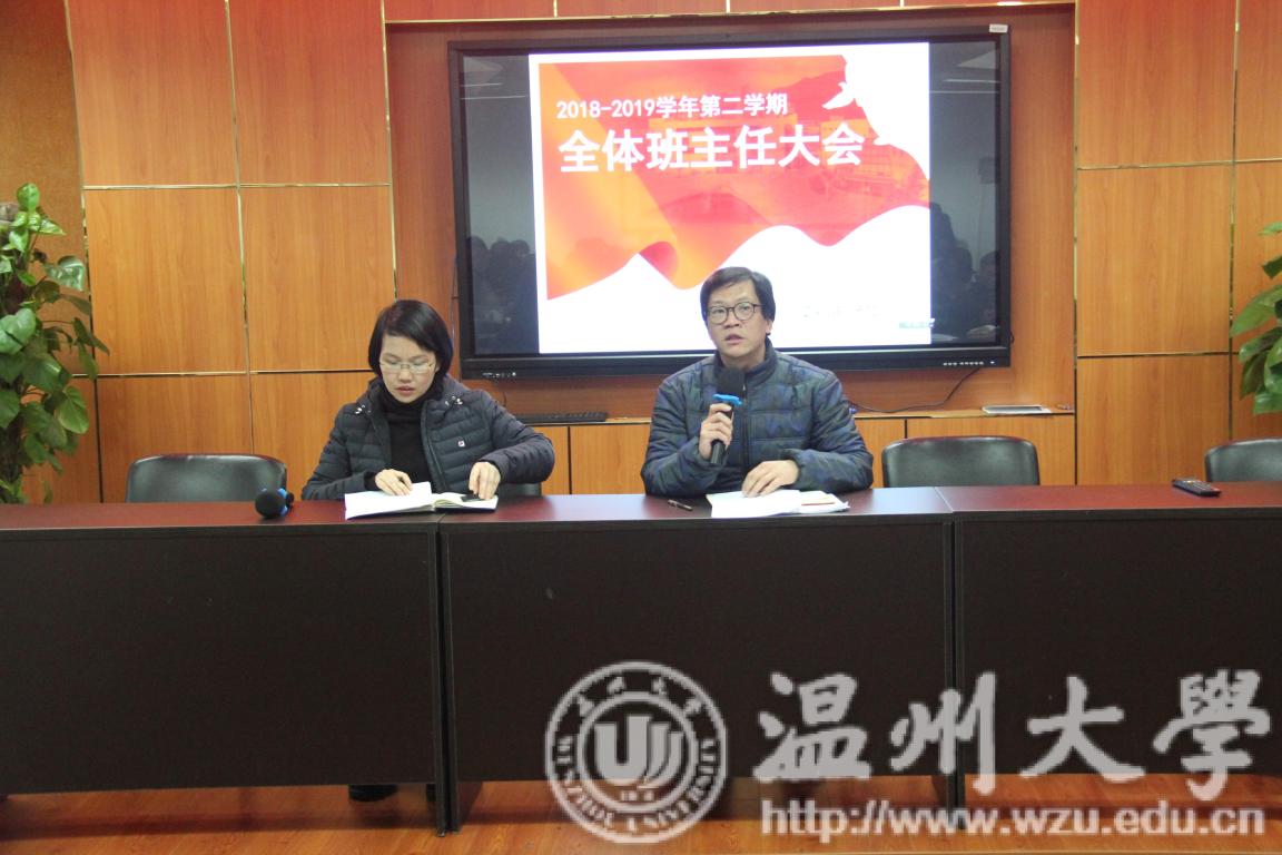 新学期,新风貌。为进一步加强班级建设,增强班主任工作的主动性,促进学院德育工作全面开展,2月27日下午,性爱视频 在2B4001会议室召开了新学期班主任工作会议。 会上,学生科叶筱卉老师对开学初班主任基础工作做了安排部署。开学初,班主任老师要召开本学期第一次主题班会,深入了解并掌握学生思想、学习、生活等方面的情况,加强班集体建设,营造新学期浓郁的学习氛围,善于利用学工系统并做好数据维护;毕业班班主任老师须重点做好未返校毕业生的安全教育工作,毕业班班主任还要认真做好毕业生就业指导与服务工作,尽早达成就业意向。叶老师还通报了学生返校情况,并就上学期“优秀学生干部”和“工作积极分子”评选结果向班主任老师征求意见。 学院党总支副书记杨振海强调,班主任老师身兼多职工作在育人的第一线,为学院德育工作做出了很大贡献。本学期班主任老师们要重点做好三方面工作:一是在大数据时代要利用好学工系统的各种数据库开展育人工作;二要重点关注和帮扶心理健康和学业困难学生;三是交通安全、财产安全和防诈骗等安全教育要常抓不懈。