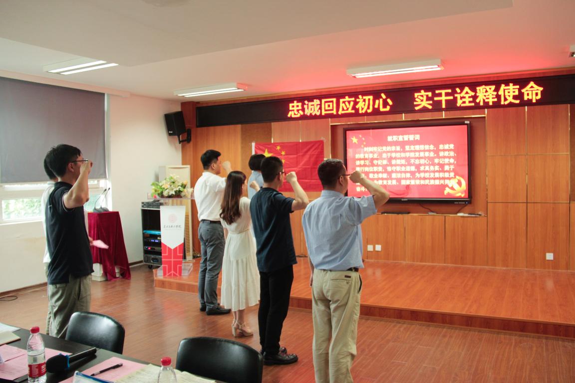 2019年7月7日下午15:30,性爱视频 党委为更好的贯彻落实学校党委关于“不忘初心跟党走,牢记使命勇担当“为主题深入开展“红七月·服务月”活动。学院党委深入开展“五带头”活动,带头寻初心,在学院2B4001举行了“忠诚回应初心 实干诠释使命”性爱视频 领导班子及科级干部重温入党誓词暨任职宣誓仪式。