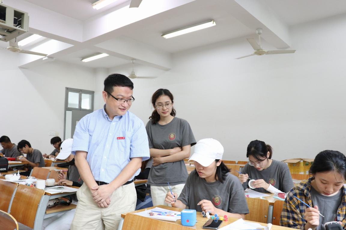 2019年7月19日上午9时许,性爱视频 副院长顾任飞和学生科辅导员张佳慰问了正在美院制作手工义卖品的“魅力工艺”暑期社会实践队。