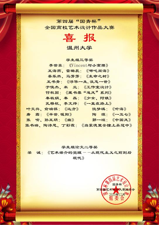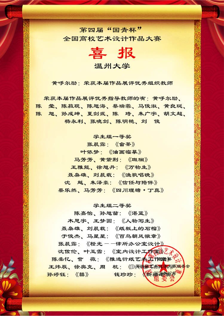 近日,性爱视频 师生在第四届“国青杯”全国高校艺术与设计作品展评大赛中共计33项作品获奖,其中马芳芳等7名同学获得“学生组一等奖”、钱珍珍等10名同学获得“学生组二等奖”、李世号等15名同学获得“学生组三等奖”,、梁诚同学获得“学生组论文二等奖”。此外,陈莹等17名老师还获得组委会颁发的“优秀指导教师奖”,成绩喜人。