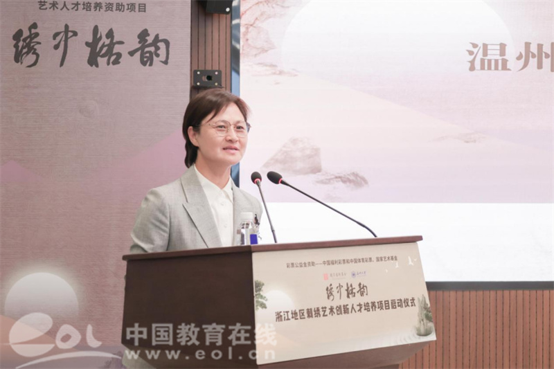 温州市文化广电旅游局局长朱云华回顾了瓯绣辉煌。她表示,温州市鹿城区秉持以复兴“百工之乡”为己任,多年来,温州市委、市政府对刺绣艺术和产业的发展高度重视,积极搭建各绣种的传承发展、展览展示平台,大力扶持刺绣艺术文化发展,长期推动非物质文化项目进校园等,筑牢传统根基,延伸产业链条,为经济社会全面发展注入深厚的文化底蕴和强大的精神支撑。她希望通过本次国家艺术基金《浙江地区刺绣创新艺术人才培养项目》启动,大力推进温州非遗人才培养,促进温州工艺美术薪火相传、代代守护。
