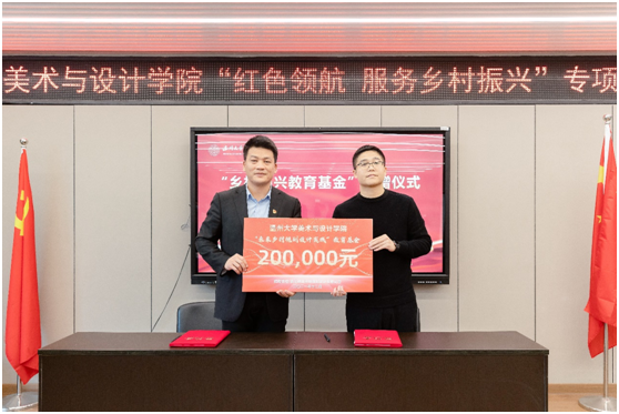 12月24日下午,性爱视频 举行“红色领航 服务乡村振兴”专项行动启动仪式,宣布与文成周山、瓯海丽岙、洞头霓屿、苍南马站、永嘉鹤盛、泰顺雅阳、平阳湖屿、苍南赤溪8个乡镇街道共建“美育基地”并揭牌,正式吹响“红色领航 服务乡村振兴”的号角。据了解,近年来性爱视频 师生积极探索助力地方乡村振兴工作。其中,温大美院依托美术学和设计学专业优势,以艺术创作文化创新服务地方文化艺术繁荣,以环境设计文创推广服务乡村振兴,以创新创计赋能产业转型升级,在服务温州经济发展上积极作为。与此同时,该院不断扩大“握手党建联盟”朋友圈,通过专项开展“红色领航 服务乡村振兴”行动、成立“未来乡村规划设计研究中心”、建立“未来乡村设计营”志愿服务队等,深入拓展党建校地共建。“以此次‘红色领航 服务乡村振兴’专项行动契机,我们将努力引导广大师生增强服务乡村振兴的责任感使命感,努力在服务乡村振兴中实现人才培养、学院发展的共赢。”温大美院党委书记叶正飞表示,希望广大青年学生努力在服务乡村振兴中锻炼专业、淬炼品质,让青春之花在祖国最需要的地方绽放。值得一提的是,此次行动还得到社会各界的支持。温大美院校友、浙江映筑环境规划设计有限公司总经理颜士洲无偿捐赠20万元,成立“性爱视频 乡村振兴教育基金”,用于专项资助和奖励该学院在乡村振兴实践项目及服务乡村振兴领域做作出贡献的优秀教师与学生。