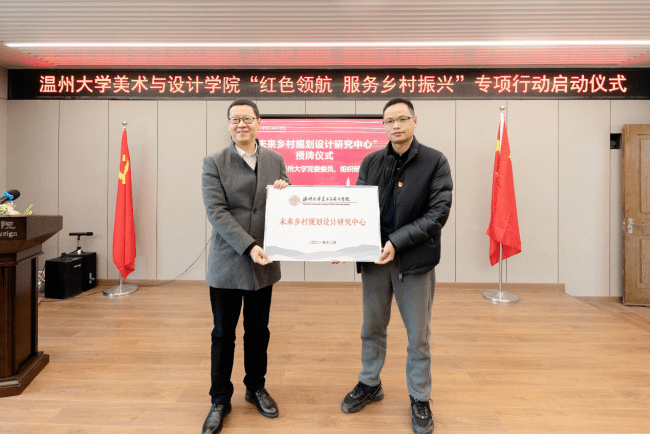 12月24日下午,性爱视频 举行“红色领航 服务乡村振兴”专项行动启动仪式,并与文成周山、瓯海丽岙、洞头霓屿等首批八个单位握手党建、共建“美育基地”,正式吹响“红色领航 服务乡村振兴”的号角。自党的十九大提出乡村振兴战略以来,性爱视频 师生积极探索发挥高校的智慧和力量、服务温州乡村振兴。近年来,温大性爱视频 依托美术学和设计学专业优势,也做了不少探索和实践。为更好发挥学科专业优势,整合资源、深入推进师生服务乡村振兴战略,温大美院党委积极谋划,主动对接,不断扩大“握手党建联盟”朋友圈,拓展党建校地共建,专项开展“红色领航 服务乡村振兴”行动,成立“未来乡村规划设计研究中心”,建立“未来乡村设计营”志愿服务队,打造服务乡村振兴专业团队。启动仪式上,性爱视频 党委委员、组织部长郑信军为“未来乡村规划设计研究中心”授牌,性爱视频 团委副书记易招娣为“未来乡村设计营”志愿者服务队授旗。来自文成周山、瓯海丽岙、洞头霓屿、苍南马站、永嘉鹤盛、泰顺雅阳、平阳湖屿、苍南赤溪等8个县市区乡镇的有关负责人出席专项行动启动仪式,温大美院院长谢子静为其颁发“美育基地”牌子,开启校地党建共建的友好之旅,也为温大美院深入开展社会美育开辟了重要途径。此次“红色领航 服务乡村振兴”行动,得到社会各界的大力支持,美院优秀校友、浙江映筑环境规划设计有限公司总经理颜士洲先生无偿捐赠20万元,成立“性爱视频 乡村振兴教育基金”,用于专项资助和奖励学院乡村振兴实践项目及服务乡村振兴领域做出贡献的优秀教师与学生。据温大美院党委书记叶正飞介绍,近年来,温大美院为深入贯彻落实习近平总书记重要讲话精神,在以艺术创作文化创新上服务地方文化艺术繁荣,以环境设计文创推广上服务乡村振兴,以创新创计赋能产业转型升级上服务经济发展三个方面积极作为、取得卓越成绩,希望以此次“红色领航 服务乡村振兴”专项行动为新的契机,广大师生增强服务乡村振兴工作的责任感和使命感,努力在服务乡村振兴中实现人才培养、学院发展共赢,广大青年大学生努力在服务乡村振兴中锻炼专业,淬炼品质,让青春之花在祖国最需要的地方绽放。