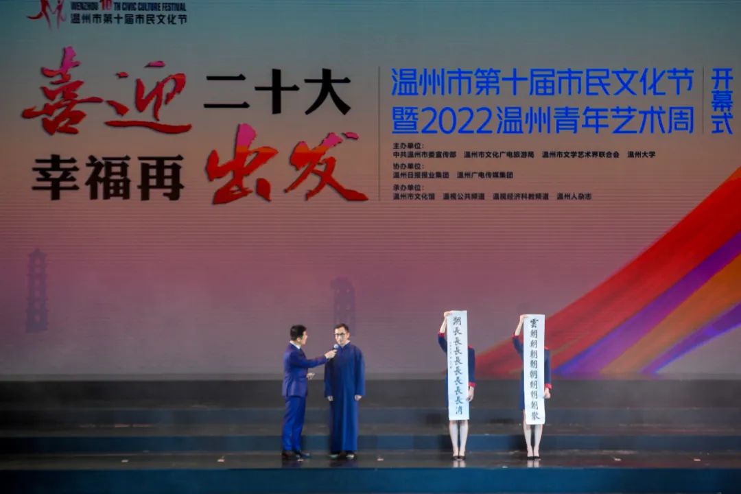 5月7日晚,2022市民文化节暨青年艺术周在温州大剧院举行开幕式。声乐、舞蹈、器乐、书法等艺术形式表达爱温州、爱艺术的情愫,琳琅满目,美不胜收。温大美院教师陈胜武在音诗画《有根有梦有远方》节目中,现场演绎书写了江心寺著名对联。