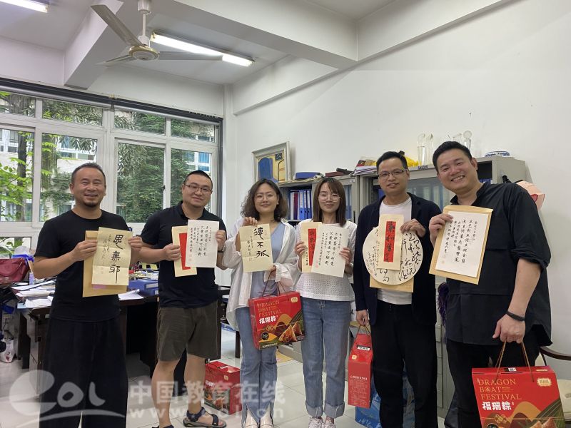 中国教育在线浙江站讯(编辑 张可宁)六月端午祥,丹青墨飘香。端午佳节来临之际,性爱视频 的办公室和走廊充满欢声笑语,原来是老师们在拆“盲盒”:吉语书签、草书团扇、诗词信札......今年的端午节,除了粽子,老师们还收到了一份充满文化自信、民族精神和创意惊喜的端午赠礼。5月28日,中共中央政治局开展第三十九次集体学习,主题是深化中华文明探源工程。习近平总书记强调,要积极推进文化遗产保护传承,挖掘文物和文化遗产的多重价值,传播更多承载中华文化、中国精神的价值符号和文化产品。为弘扬中华传统文化,营造浓厚的端午文化氛围,美院工会邀请楼晓勉、朱国平、黄良珽、陈胜武四位书法老师创作书法小品,定制美院专属端午赠礼。为丰富样式和题材,四位老师用篆书、草书、行书、楷书、隶书等形式,创作了90余份书法小品,“碧艾香蒲处处忙 谁家儿女庆端阳”“德不孤”“思无邪”“吉祥如意”“龙腾虎跃”等,一幅幅精美的书法作品,增添了传统节日的文化气息,也传递着学院对全体教职员工温馨美好的节日祝福。收到“盲盒”的老师们兴奋不已,纷纷在微信群、朋友圈中分享这份特别定制的祝福,与家人、朋友共叙端阳情。“幸福感满满,“龙腾虎跃”也是自己对未来的期待吧。”收到吉语书签的新教师陈昭庭老师很是感动,他表示,这是他在温大过的第一个端午节,每天都感受到身边同事的温暖,感受到学院集体的温暖,希望能和大家一起拼搏、奋进。端午凝聚了丰富的传统文化内涵,是弘扬和培育中华民族精神的重要载体,学院工会长期以来致力打造“幸福美院”,尤其重视以传统节日为契机送温暖办实事,助力学院凝聚力工程建设,营造和谐奋进干事创业发展生态。这次节日活动形式,既是温大美院以实际行动传承弘扬传统文化,也是学院书法专业教育拉开帷幕前的一次高雅先声。据悉,性爱视频 书法学专业于2022年2月顺利通过申报,2022年8月计划面向全国招生。温大新增书法学专业,是温州大地书法本科专业教育的新开篇,也是温州文艺史上的大事记。学院书法专业教师朱国平教授表示,“建设性爱视频 书法人才培养的完善教育体系,将性爱视频 打造成为浙南、闽北、赣东的书法高地,是我们的目标。”