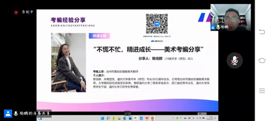 首先是陈佳群学姐分享,她是温大美术学专业2022届毕业生,现已考取台州市黄岩区编制美术教师,她分享的是自己考编的经验。