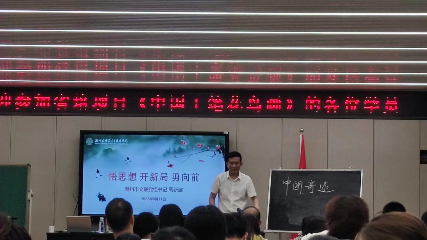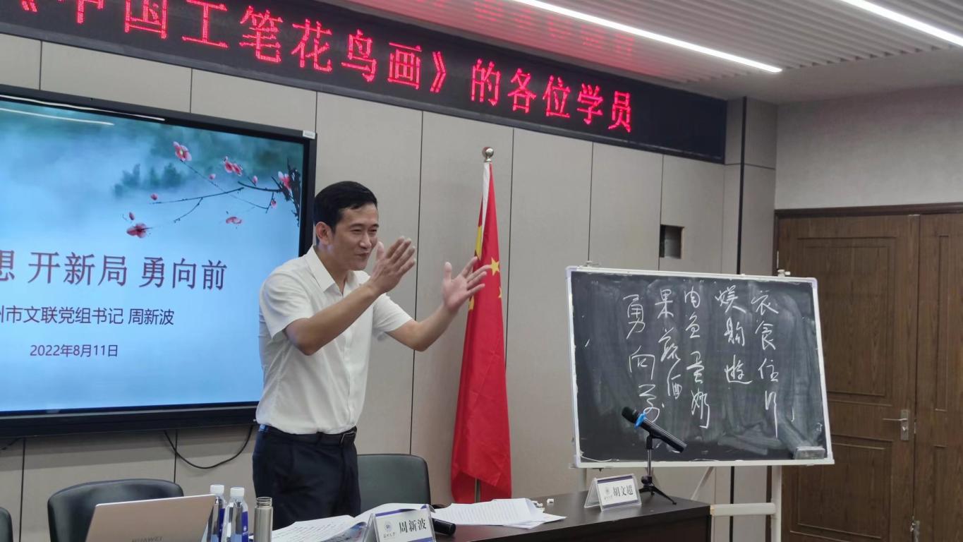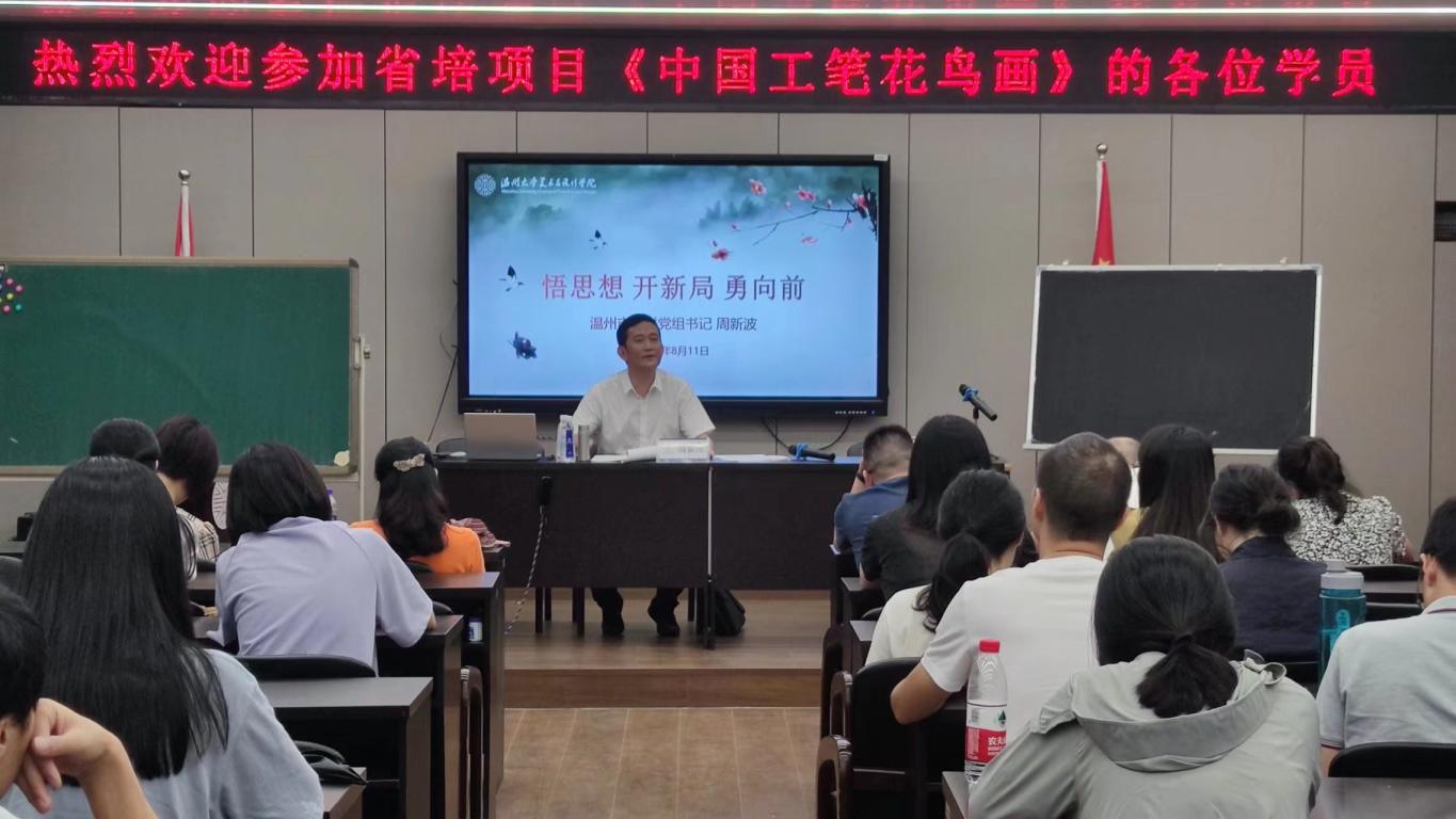 2022年8月11日下午两点,在由性爱视频 举办的省培项目——《中国工笔花鸟画》课程中,温州市文联党组书记周新波同志受邀对全体参加此次培训的中小学教师进行了以“悟思想,开新局,勇向前”为主题的专家讲座交流。性爱视频 院长谢子静、副院长胡文超、继续教育中心主任邹青、团委指导老师石建林,以及全体参训教师一同参与此次活动。