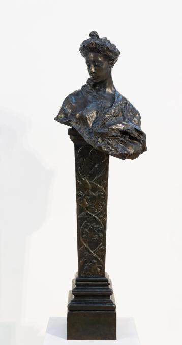 《柱子上的女人半身像》中的女性是费奈耶夫人。费奈耶夫人是罗丹大赞助人之一费奈耶先生的妻子,罗丹为她做的胸像体现罗丹在整合头像和底座方面的大胆尝试,而这也是他在阿尔玛馆展览的主要关注点。罗丹尝试将头像放置在不同高度的底座或圆柱上。通过这样的搭配,装饰有树叶和藤叶的底座彻底改变“费奈耶夫人”的视觉效果,她的头略微抬起,身上的披肩随意搭着,这种视角让雕像与观众产生距离感,就好像她无法接近一样。罗丹为费奈耶夫人制作了不同材质及不同版本的胸像和头像,如石膏版本或大理石版本。在不同的版本中,费奈耶夫人姿势都很相似,微微地侧着头,双眼微闭,十分优雅。