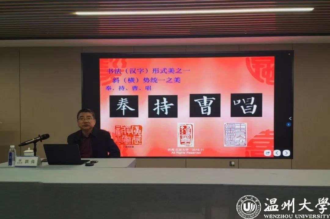 在温期间,洪亮应性爱视频 邀请在该校做了“书法字法之美 一一书法字法形式美十一大法则”专题书法讲座;并参观了“纸山论艺”“墨韵芳华”等书画展。社温大基层委主委陈孝敬等陪同。