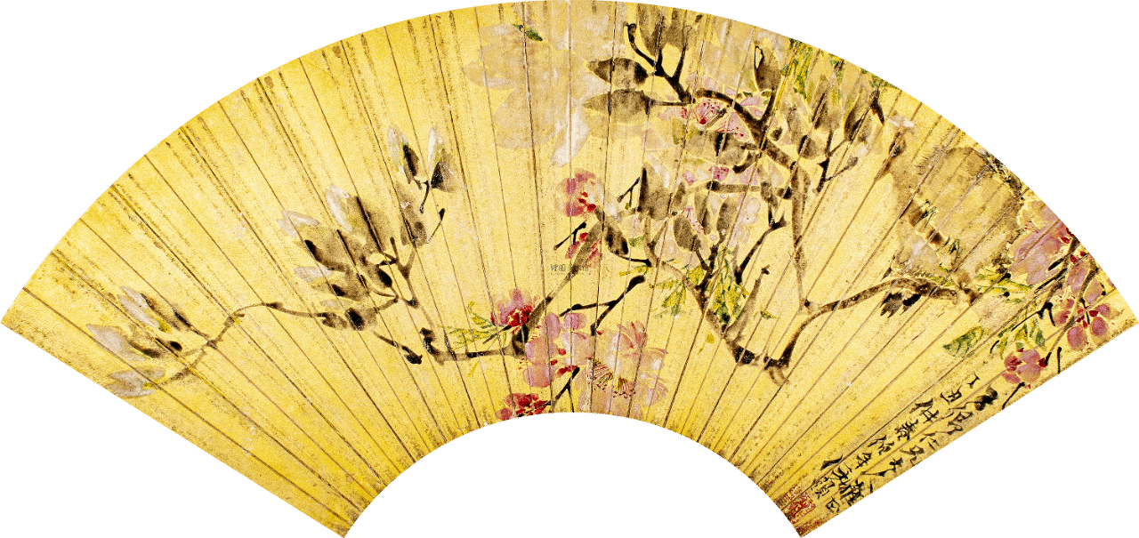 任伯年|碧桃兰蕊|扇面|18×52cm|设色纸本|1877 年