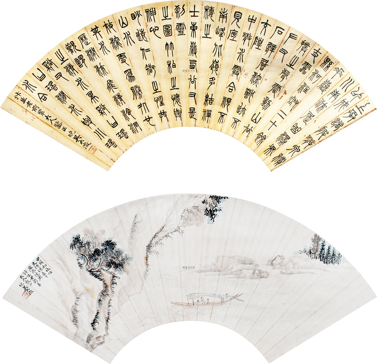 吴大澂|《水经注·清水》节录、山水|扇面|18×53cm×2|泥金纸本、设色纸本|1874 年
