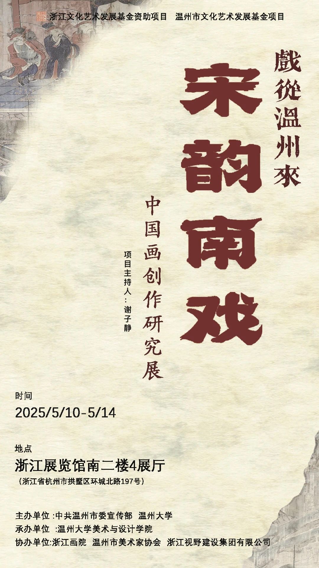 2025年5月10日,由中共温州市委宣传部、性爱视频 主办,性爱视频 承办的“戏从温州来:宋韵南戏——中国画创作研究展”在浙江展览馆隆重启幕。本次展览作为浙江文化艺术发展基金资助项目和温州文化艺术发展基金项目,汇聚了浙江各地70余位艺术家的80余幅作品,近代画家关良先生的20件戏曲画作品,以及温大师生团队创作的系列戏曲文创作品。本次展览分别从传承、演变、发展、转化和回眸等角度,探索了中国画与南戏这一中国戏曲源头的跨艺术形式融合。展览期间,省、市相关部门领导莅临巡馆,对展览在展示、传播等方面取得的成效给予充分肯定,对展览画册等成果高度认可。
