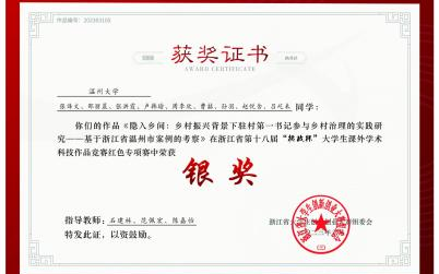 不忘党的嘱托,用实际行动证明自己。张译文积极投身于建设“和美乡村”的研究工作。担任班级团支部书记期间,她带领团支部成员走进温州市的乡村基地,实地探访了多位驻村第一书记。通过深入交流、细致观察,张译文及其团队对“建设和美乡村”的实际状况有了全方位、深层次地了解。凭借这份扎实的调研成果,她和团队在浙江省“挑战杯”红色专项赛道中脱颖而出,斩获银奖。