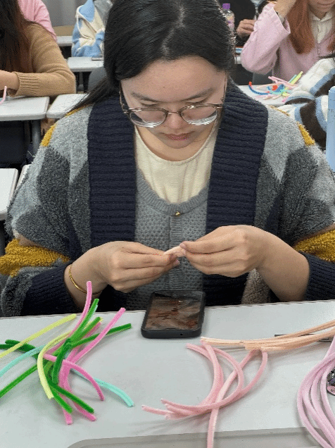 3月12日的扭扭棒手作活动从花朵、动物到创意摆件,扭扭棒的百变可塑性激发创造力。活动将艺术疗愈与心理教育相结合,培养同学们审美力、劳动意识,传递“以劳健心”的理念。通过扭扭棒手工创作,同学们将内心情感具象化,帮助个体梳理情绪、接纳自我。
